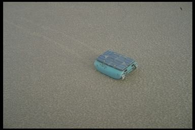 It is the first KYTRON to have solar cells. In bright sunlight these cells deliver enough energy to completely power the logic and the motors. In dimmed light they charge the batteries. In the dark this KYTRON is able to drive up to one hour from battery.