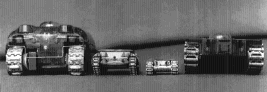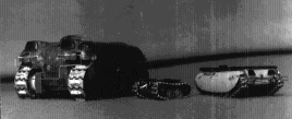 In 1975 KYTRON 2 was constructed. All the mechanics are custom fiberglass parts. Only the tracks were built from small brass hinges, which were soldered together. For interaction with the driving wheel, two notches were added on the inside of each chain link. (This MPG movie clip shows these tracks in detail, 527 K).